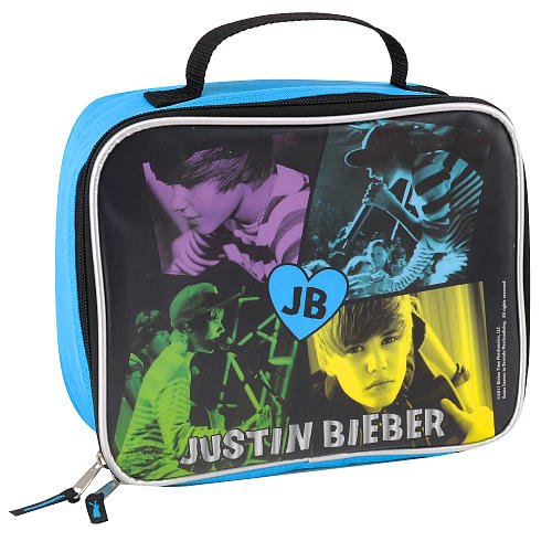 Justin Bieber Lunch, Celebrate a superstar on your way to school with this Justin Bieber Rectangular Lunch Kit. It features Justin Bieber graphics on the front and is trimmed in silver. The main compartment of this lunch kit opens with a zipper to access the padded, insulated interior, perfect for keeping food fresh throughout the day.