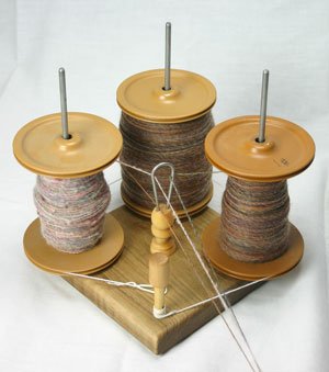 Nancy's Knit Knacks, The Katie a-Go-Go allows spinners to take a fully functional Lazy Kate with them no matter where they go. Best of all, the Katie a-Go-Go has a fully adjustable tensioning system just like the larger Lazy Kate's. The Katie a-Go-Go fully assembles in less than a minute. It has just 6 parts plus a carrying sack. There are no tools required to assemble it. The user screws the center dowel into the base by hand. They then insert the 3 steel bobbin rods. Then, they slip either 2 or 3 bobbins onto the rods and insert the tensioning dowel into the base. Lastly, they wrap the cord around the bobbins and then pull their yarn through the center dowels yarn loop. That's it!